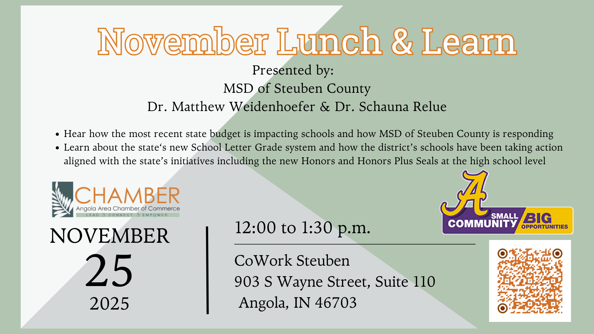 Join us at the Steuben County Economic Development CoWork Steuben space at 903 S Wayne St, Angola, IN 46703 for our last lunch and learn event of the year on Tuesday, November 25th at noon with guest presenters Dr. Matthew Widenhoefer and Dr. SchaunaRelue, with MSD of Steuben County.